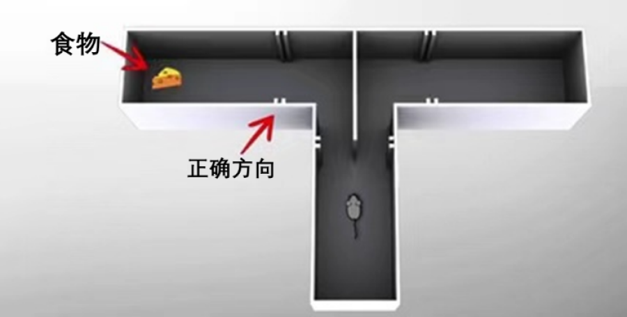 T迷宮和Y迷宮都是由三個(gè)通道臂組成。迷宮利用藏在通道臂終點(diǎn)的美食誘惑小鼠探索。實(shí)驗(yàn)開始前,實(shí)驗(yàn)人員會(huì)將下方通道臂用擋板封住,并放入小鼠。取下?lián)醢搴螅鼈儽阊兜老蚯罢沂澄铩?/p>