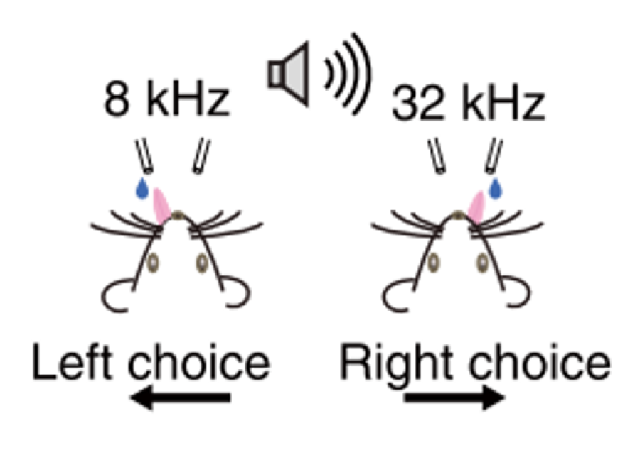 比如,在一個(gè)聽覺決策實(shí)驗(yàn)中,低頻的聲音對(duì)應(yīng)左邊的水嘴有水喝,高頻對(duì)應(yīng)右邊。小鼠首先進(jìn)行單一聲音的訓(xùn)練,通過單音訓(xùn)練分別學(xué)會(huì)這兩種對(duì)應(yīng)關(guān)系。