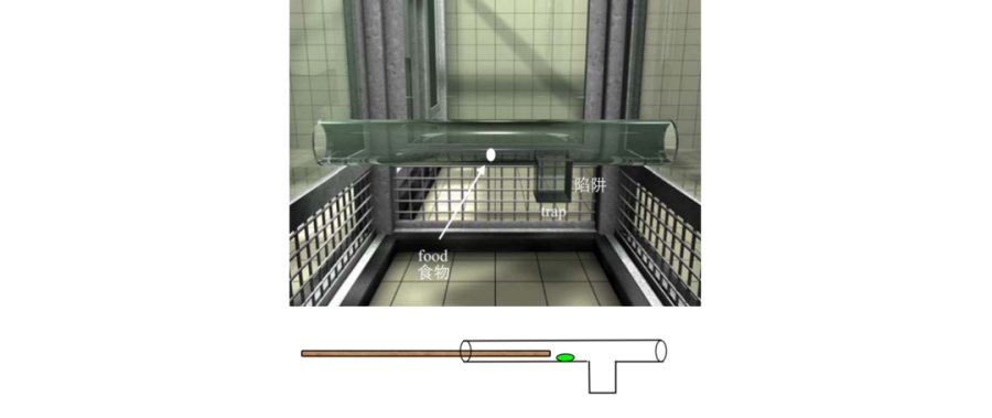 猩猩在籠內(nèi)自由活動(dòng)時(shí),可以從管道兩端伸入木棍,來獲取中間的食物。不過管道一側(cè)下方有一個(gè)方形陷阱。猩猩們需要用棍子把食物從右往左推出或者撥回食物,才能從管道取出吃到。如果食物掉進(jìn)陷阱,被試動(dòng)物就只有干著急了。