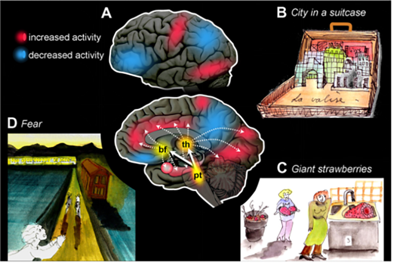 情景一體現了夢境場景和現實的分離,情景二體現的是視覺的變形;研究發現,這兩種夢境出現時大腦中負責視覺信息處理的神經通路——枕葉皮層到顳葉皮層高度激活,然而,大腦中負責更高級的、與邏輯推理相關的腦區——前額葉皮層的活動顯著下降。情景三中,人會產生的強烈恐懼情緒,這與大腦中的“恐懼中樞”杏仁核的激活有關。