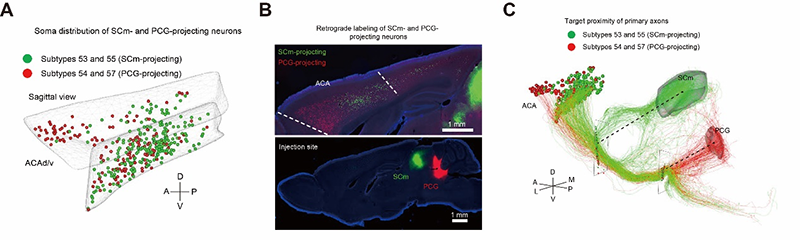 通過對這些神經(jīng)元進(jìn)行形態(tài)學(xué)的分析,團(tuán)隊(duì)發(fā)現(xiàn)小鼠前額葉皮層神經(jīng)元可以分為3個大類。即皮層椎體束神經(jīng)元、皮層內(nèi)投射神經(jīng)元、皮層丘腦束神經(jīng)元。通過對這三大類型神經(jīng)元形態(tài)的深入分析,作者發(fā)現(xiàn)其可以進(jìn)一步分為64個亞型,不同亞型的神經(jīng)元往往有著不同的胞體分布、神經(jīng)元形態(tài)和投射模式。例如,亞型53和55主要分布于前扣帶回(Anterior Cingular Area, ACA)腦區(qū)的后部且主要投射到上丘的運(yùn)動相關(guān)腦區(qū)(Superior Colliculus motor related, SCm),而亞型54和57主要分布于ACA腦區(qū)的前部且主要投射到腦橋中央灰質(zhì)(Pontine central gray, PCG)(圖1)。