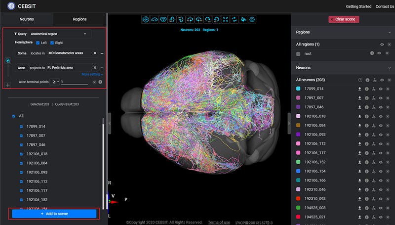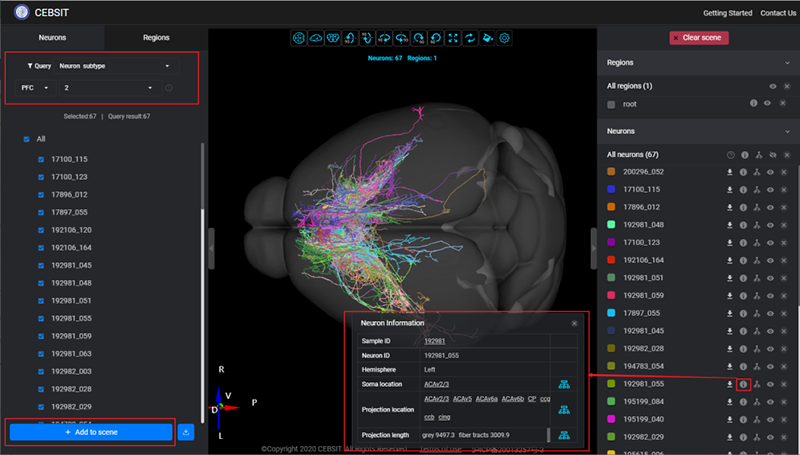 1. 便捷搜索功能:在網(wǎng)頁左側(cè)導(dǎo)航欄提供Neurons和Regions選項(xiàng),默認(rèn)顯示選項(xiàng)為Neurons。在Neurons頁,Query下拉框中支持選擇Anatomical region、Neuron subtype、ID等維度查詢。系統(tǒng)默認(rèn)為Anatomical region維度,用戶可根據(jù)神經(jīng)元的胞體位置、投射情況進(jìn)行多維度組合檢索自己感興趣的神經(jīng)元,搜索返回結(jié)果將在正下方展示神經(jīng)元的編號。在返回結(jié)果中,勾選需加載的神經(jīng)元編號,點(diǎn)擊底部的Add to scene按鈕后,則選中的神經(jīng)元將以不同的顏色實(shí)時渲染到3D腦空間上,并且在右側(cè)展示選中神經(jīng)元的信息,支持查看神經(jīng)元的所屬樣本與投射信息。另外,也支持按照類型進(jìn)行檢索,并批量實(shí)時渲染到視圖中。