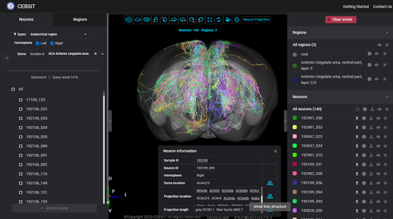 2. 多元化信息可視化:系統(tǒng)支持腦圖譜多元多維化數(shù)據(jù)可視化,除支持神經(jīng)元二維與三維信息可視化,還支持腦區(qū)模型以及二維信息實(shí)時可視化。用戶可點(diǎn)擊導(dǎo)航欄上的Regions 選項(xiàng),支持在樹形結(jié)構(gòu)上進(jìn)行勾選或者通過搜索框進(jìn)行模糊搜索。當(dāng)勾選需要渲染的腦區(qū),點(diǎn)擊底部的Add to scene按鈕后,則選中的腦區(qū)信息將已豐富的顏色實(shí)時渲染到3D腦空間上,并且在右側(cè)展示選中腦區(qū)的信息。