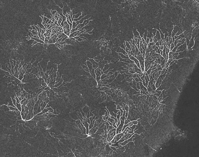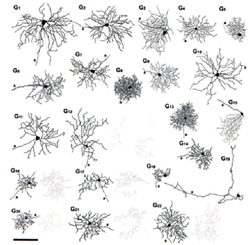 其實不管是迎面撲來的貓,還是從天上飛下來的貓頭鷹,小鼠看到的只是一個向它逼近的黑影。研究員們發現,只需要給小鼠看這么一個由小變大的黑色的圓,小鼠就會觸發逃跑和僵直反應。而阿爾法細胞正好可以看到這種逼近的黑影的刺激。當記錄阿爾法細胞,并提供逼近黑影的刺激供其觀看時,研究員們發現,阿爾法細胞會對逼近黑影產生反應,而且反應強度可以對逼近視覺刺激的大小進行調整,也就是說,小鼠能夠通過阿爾法細胞對捕食者的距離進行判斷。阿爾法細胞的樹突(接收信號的結構)就像一個個面向太空的雷達,長長的天線組成一個寬大的網。整個視網膜中有上千個這種細胞,它們互相重疊,不漏過視野里的每個點。這類細胞還有一根粗大的軸突(傳出信號的結構),軸突能夠像電纜一樣傳輸信號。這個“電纜”的特殊之處是有絕緣外套包裹,相較于其他細胞,它能夠更快地將信號傳導至腦中。