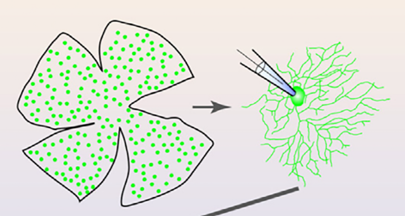 雖然研究員們早已猜到了這類細胞,但是這類細胞零散地分布在視網膜中,每次研究員們只能隨機抓取一個細胞,能不能碰見下一個,完全靠運氣。得益于深入的基因研究,研究員們找到了在阿爾法細胞中特異表達的一個基因。此后,研究員們培育了轉基因小鼠,通過這種方法,他們可以將該細胞點亮,讓它在眾多的細胞中脫穎而出。而且可以通過特殊的方法來控制這群細胞,進而證明這類細胞的功能是什么。