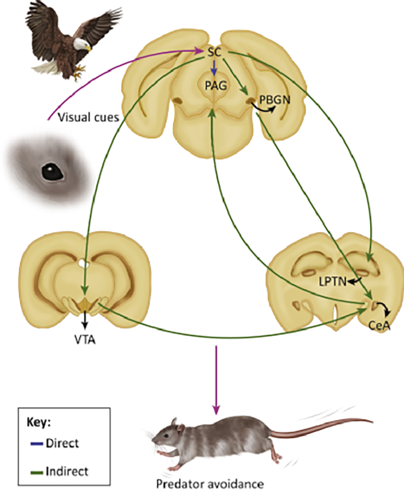 當阿爾法細胞看到逼近黑影的刺激后,它會向大腦輸出電信號。這個電信號可以不經過小鼠的大腦皮層,直接進入負責防御行為的腦區。這是一條由視網膜到皮層下通路的高速路,直接將危險轉化為行動。這條高速路從視網膜開始,將危險信號傳輸到腦中一個叫“上丘”的地方,然后“兵分兩路”,一路到指揮運動的腦區,啟動防御行為;另外一路則抵達負責恐懼的腦區---杏仁核(長得像杏仁),從而使小鼠產生恐懼情緒。如此一來,危險信息就不用先通過大腦皮層(產生思維意識的地方)處理,再經由運動相關的腦區來輸出行為,信息傳遞通路也大大縮短了。此時,動物不經過思考就能做出行動,有了“下意識”一樣的反應。這樣一條報警專線加上快速反應系統,幫助動物們能夠快速躲避捕食者的偷襲。