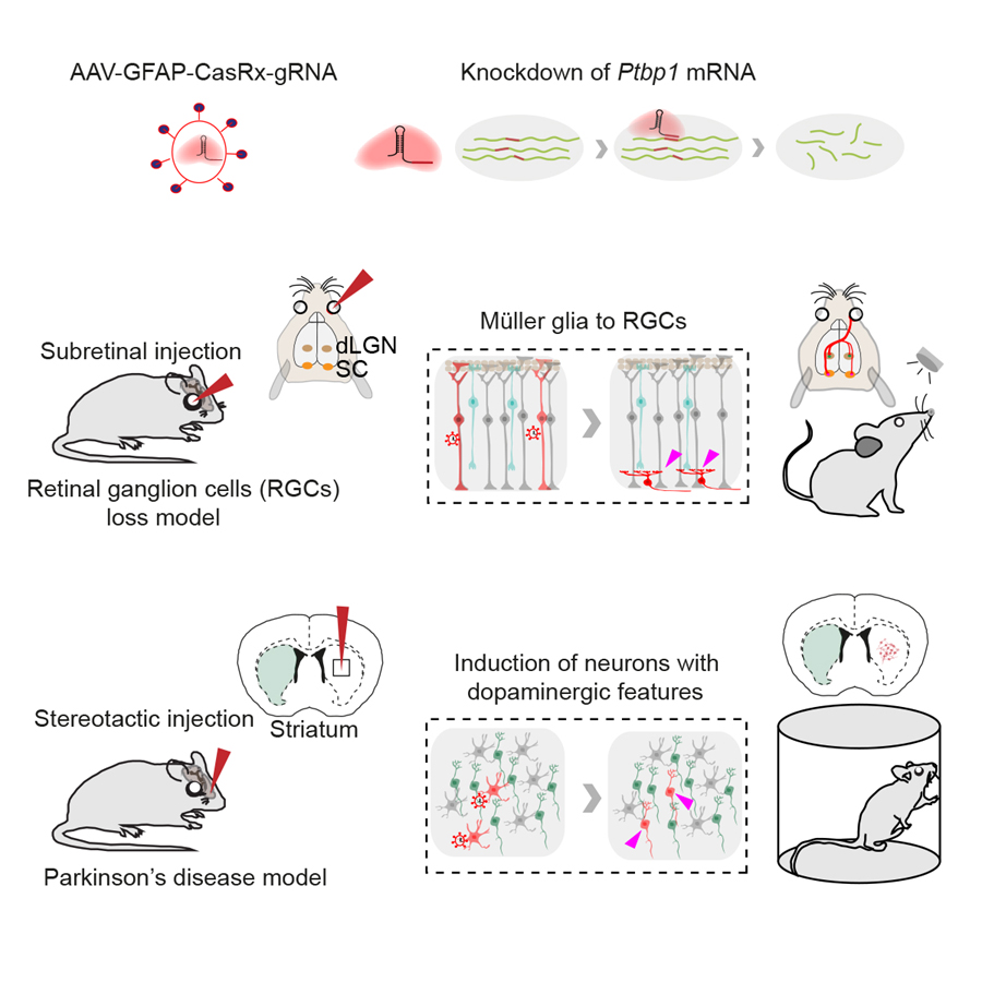 圖注:(上)CasRx通過靶向的降解Ptbp1 mRNA從而實現(xiàn)Ptbp1基因表達的下調(diào)。(中)視網(wǎng)膜下注射AAV-GFAP-CasRx-Ptbp1可以特異性的將視網(wǎng)膜穆勒膠質(zhì)細胞轉(zhuǎn)分化為視神經(jīng)節(jié)細胞,轉(zhuǎn)分化而來視神經(jīng)節(jié)細胞可以和正確的腦區(qū)建立功能性的聯(lián)系,并且提高永久性視力損傷模型小鼠的視力。(下)在紋狀體中注射AAV-GFAP-CasRx-Ptbp1可以特異性的將星形膠質(zhì)細胞轉(zhuǎn)分化為多巴胺神經(jīng)元,從而基本消除了帕金森疾病模型小鼠的運動癥狀。