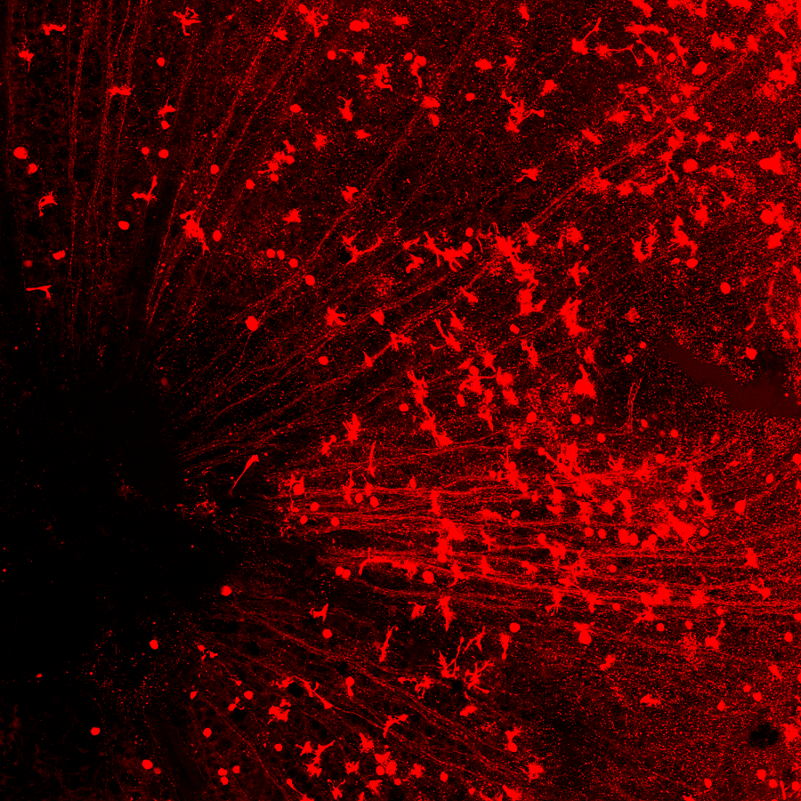 視神經(jīng)部位是連接眼睛和大腦的橋梁。每一條紅色的線是每一個再生出來的視神經(jīng)節(jié)細胞發(fā)出的軸突,通過這里,這些新生軸突將會與大腦中處理視覺信號的區(qū)域正確相連。