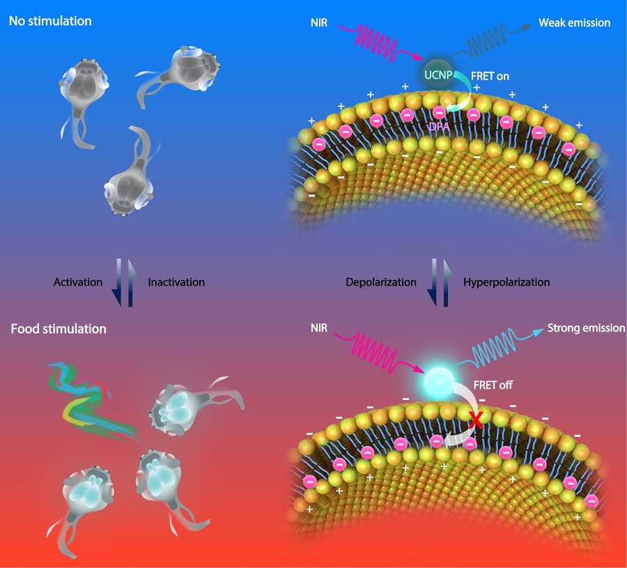 圖注:電壓納米探針的設計及其感應機理。首先,UCNPs固定在神經元細胞膜上。其次,將六硝基二苯胺(DPA)嵌入細胞膜磷脂雙分子層。在神經元靜息狀態(tài)下,帶負電荷的DPA在細胞膜外側富集,UCNP與DPA之間形成發(fā)光共振能量轉移體系(FRET),UCNPs發(fā)光被DAP吸收,檢測到的光信號弱。當神經元去極化后,DPA在電場作用下在細胞膜內側富集,FRET效應減弱,從而恢復UCNPs的發(fā)光。