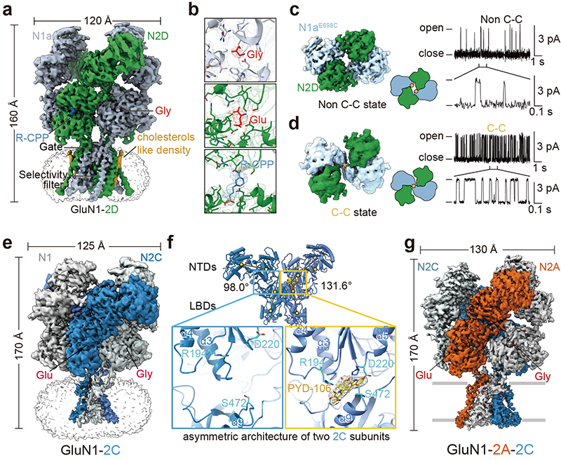 圖2. 含有GluN2D和GluN2C受體的三維結構、門控機制和藥理學特性。a,GluN1-N2D受體的三維結構。b, 甘氨酸、谷氨酸和競爭性抑制劑R-CPP在其結合口袋中的電子密度云。c, d, GluN1E698C-N2D突變型受體在二硫鍵交聯和非交聯狀態下的三維構象和單通道性質。e, GluN1-N2C受體的三維結構。f, GluN1-N2C受體的非對稱性構象及選擇性變構抑制劑PYD-106的結合口袋。g, GluN1-N2A-N2C受體的組裝模式和拓撲結構。