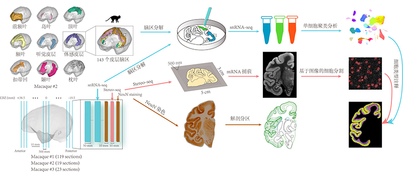 圖1. 總體實(shí)驗(yàn)設(shè)計(jì)。利用Stereo-seq技術(shù)采集了3只獼猴左半腦的161張厚度為10微米切片的空間轉(zhuǎn)錄組數(shù)據(jù)。同時(shí)利用顯微切割結(jié)合單細(xì)胞核轉(zhuǎn)錄組測序技術(shù)了獲得了百萬級別的獼猴大腦皮層單細(xì)胞核轉(zhuǎn)錄組數(shù)據(jù)。通過單細(xì)胞核轉(zhuǎn)錄組和空間轉(zhuǎn)錄組整合分析,繪制了食蟹猴大腦全皮層的三維單細(xì)胞空間分布圖譜。