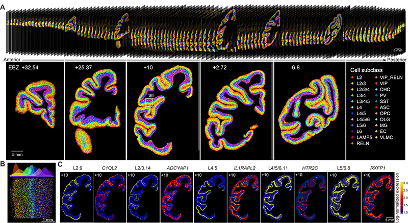 圖2. 獼猴大腦皮層細(xì)胞類型空間分布圖譜。(A) 數(shù)百種細(xì)胞類型在獼猴大腦不同位置(上)以及5張典型代表性切片(下)上的空間分布。(B)多種細(xì)胞類型呈現(xiàn)各層面的分布特異性。(C)五種細(xì)胞類型及其特征基因的空間分布和表達(dá)模式。
