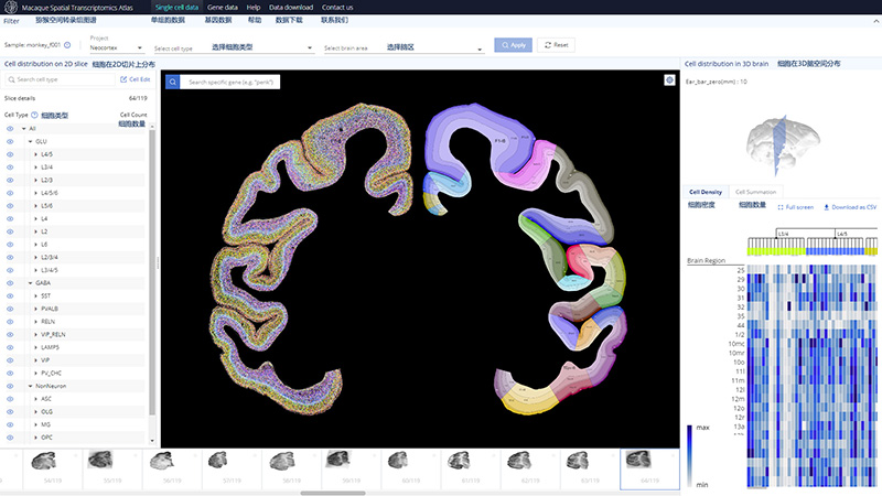 該研究產(chǎn)生了較為完整的世界首套獼猴全腦皮層的單細(xì)胞以及空間轉(zhuǎn)錄組數(shù)據(jù),為后續(xù)相關(guān)研究提供了重要的數(shù)據(jù)資源庫,現(xiàn)已實(shí)現(xiàn)公開共享(https://macaque.digital-brain.cn/spatial-omics)(圖3)。