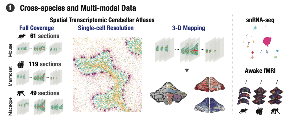 9月27日,?Science期刊在線發表了題為“Cross-species single-cell spatial transcriptomic atlases of the cerebellar cortex?” 的研究論文,該研究成果由中國科學院腦科學與智能技術卓越創新中心(神經科學研究所)聯合杭州華大生命科學研究院、上海腦科學與類腦研究中心、中國科學院遺傳進化與動物模型重點實驗室、臨港實驗室、華南理工大學、騰訊AI Lab等單位80多人的科研團隊合作完成。