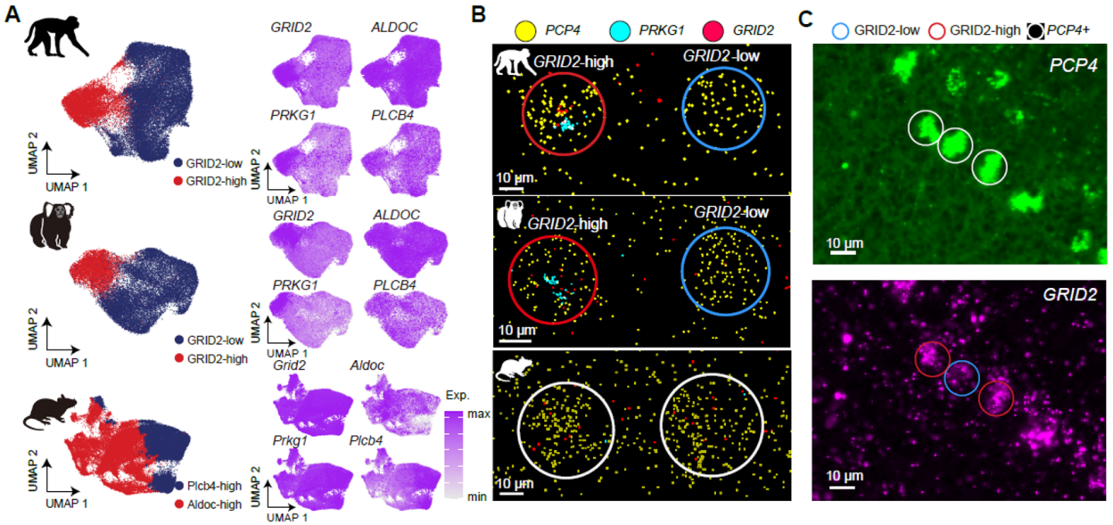 特別值得注意的是,研究人員在Stereo-seq數據中發現了靈長類特異性的浦肯野細胞亞型(GRID2-high Purkinje),并通過RNAscope實驗和人類的單細胞轉錄組數據驗證了這一發現。進一步的研究還揭示了GRID2高表達細胞在誘導長時程抑制(LTD)相關基因表達方面的顯著差異,以及與其他谷氨酸受體亞基表達模式的差異。