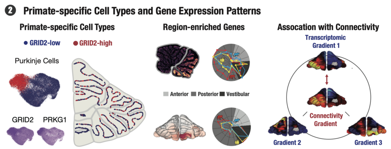 通過收集和分析清醒小鼠、狨猴以及公開的獼猴的靜息態fMRI數據,研究人員發現了小腦皮層內的功能連接梯度,即“小腦內功能梯度”。這些梯度展示了不同小腦區域之間連接性的三維空間模式。通過實現空間轉錄組的三維重建和梯度分析,研究人員近一步發現,在所有三個物種中,功能梯度1和轉錄組梯度1都顯示出明顯的前后差異,且獼猴和狨猴之間的空間模式相似性高于它們與小鼠之間的相似性。此外,通過跨物種預測模型的驗證,發現了基因表達與小腦內功能連接之間的密切關系,并且確定了與功能梯度相關的基因。這些基因在不同物種中的表達模式和富集的細胞類型存在差異,進一步強調了物種間的分子和功能差異。