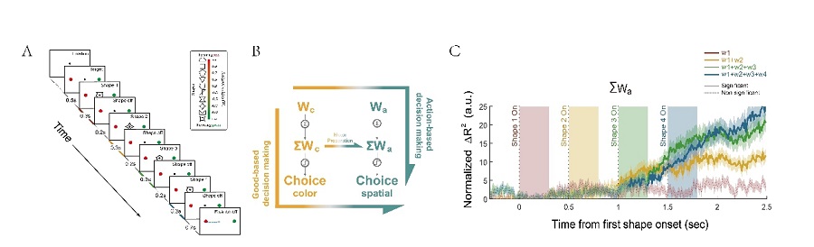 圖注(A)獼猴行為學范式(B)兩種假設。其一在視覺特征空間完成,其二在運動空間完成,價值信息由視覺特征空間向運動空間的轉換可以發生在單個證據階段,或者在證據累積完成后的階段(C)背外側前額葉對價值信息在運動空間累積的編碼