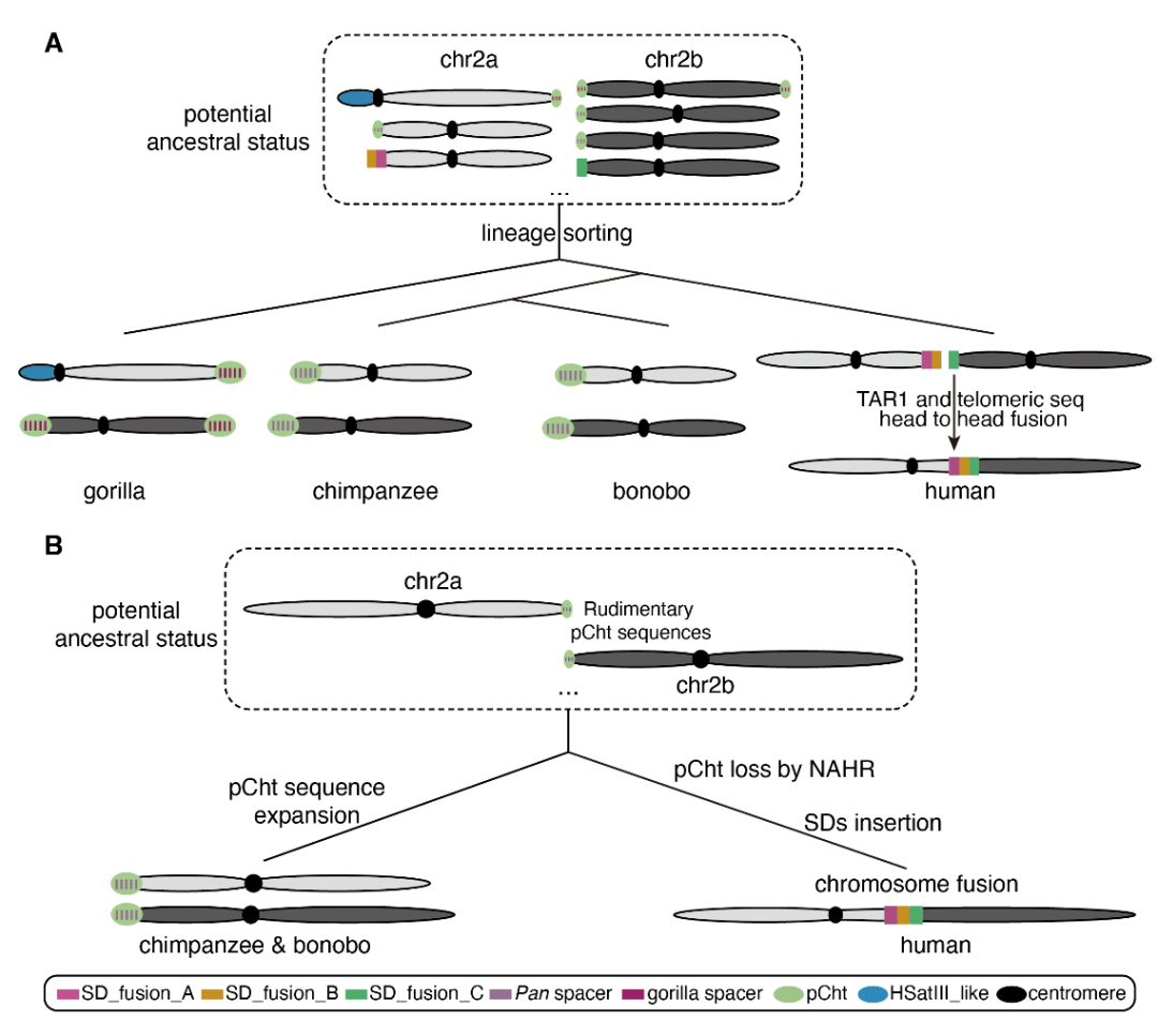 在人類與其他大猿之間,染色體數量的差異一直被視為靈長類演化中最醒目的標志之一。人類(23對染色體)相較于黑猩猩、大猩猩等大猿少一對染色體,其根源在于染色體2a與2b在進化過程中發生了“頭對頭”融合,形成了現代人類的2號染色體。1991 年,研究者在2q13–2q14區域發現反向排列的端粒重復,為端粒–端粒融合提供了最早的細胞遺傳學證據。 由于融合區域極度復雜,富含衛星DNA、轉座子以及大規模片段重復,其復雜性長期阻礙了對融合時間與形成機制的精確定義,使既往推斷跨度從90萬年至 700 萬年不等。加之早期分析手段有限,這一融合何時出現、以何種結構方式形成、是否影響了人類特有生物學特征(如大腦發育)等關鍵問題一直未得到直接證據回答。