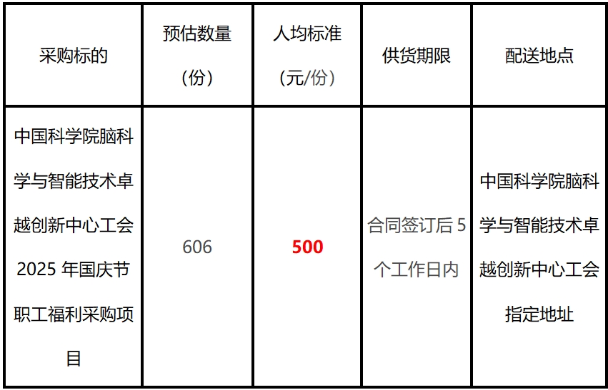 中國科學院腦科學與智能技術卓越創新中心工會需采購2025年國慶節職工福利,現進行公開招標,誠邀有意單位前來投標。?