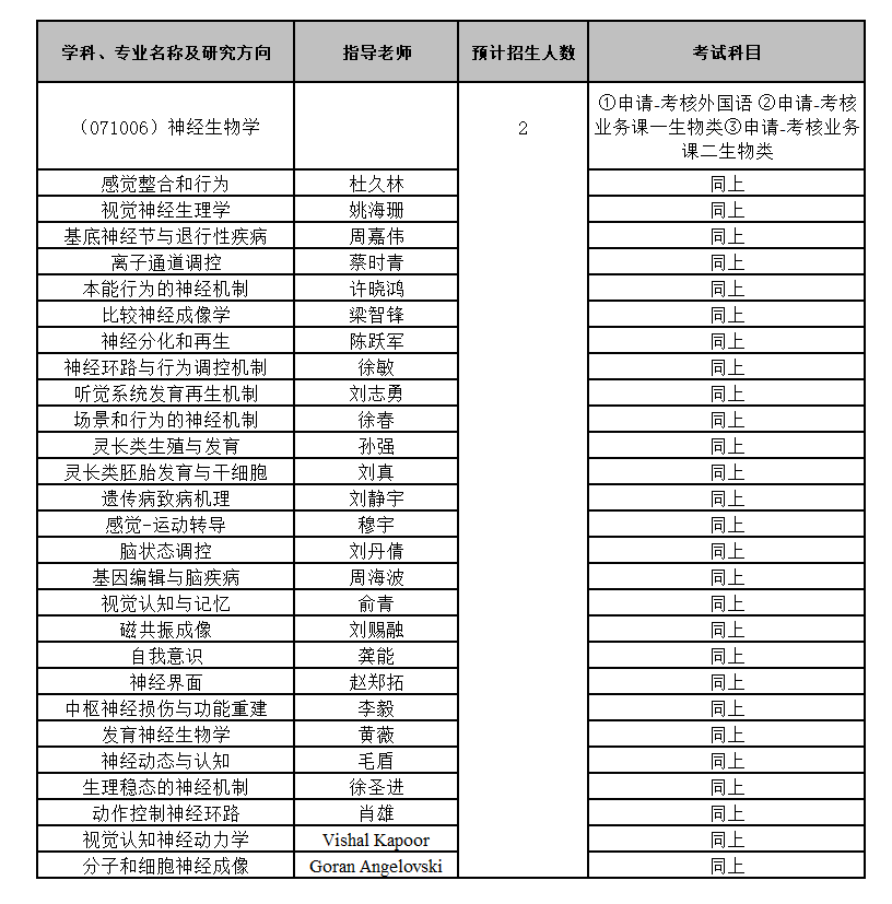 對外招生名額、學(xué)科專業(yè)(071006 神經(jīng)生物學(xué))、研究方向、指導(dǎo)老師: