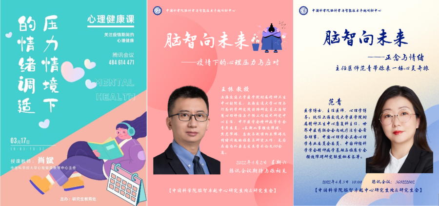 每年三四月份正值研究生轉博考核、年度考核、畢業答辯、求職就業、新生定組并開啟研究工作的關鍵期,突發的疫情又改變了既有的模式,連日居家隔離的煩悶、在線學習的壓力以及對實驗的渴望,心中難免涌起各種情緒風云。為此,從3月17日起,中心陸續邀請了國科大心理中心肖斌主任、上海交通大學醫學院附屬精神衛生中心副院長王振教授、康復科主任范青主任醫師通過云端給學生們帶來了《壓力情境下的情緒調試》、《疫情下的心理壓力與應對》、《正念與情緒互動訓練》等,緩解大家的心理情緒,提高個人抗壓能力,幫助同學們悅納自我,積極向上,坦然面對疫情,積極調試心理。