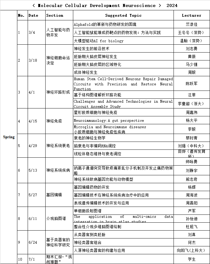 為了提高研究生的培養(yǎng)質(zhì)量,腦智卓越中心重視課程建設(shè),不斷優(yōu)化課程體系,提高課程質(zhì)量。中心于2024年3月至2024年7月開設(shè)研究生高階課程——Advanced Molecular Cellular Development Neuroscience,吸引了40名同學(xué)選課。該課程注重培養(yǎng)學(xué)生的獨(dú)立思考和創(chuàng)新能力,鼓勵(lì)他們探索新的研究領(lǐng)域和方向。講座課、討論課、匯報(bào)展示相結(jié)合的方式讓課程更加生動(dòng)。通過系統(tǒng)的高階課程學(xué)習(xí),加強(qiáng)能力培養(yǎng)、有利長(zhǎng)遠(yuǎn)發(fā)展為目標(biāo),尊重和激發(fā)研究生興趣,注重培育獨(dú)立思考能力和批判性思維,全面提升創(chuàng)新能力和發(fā)展能力。