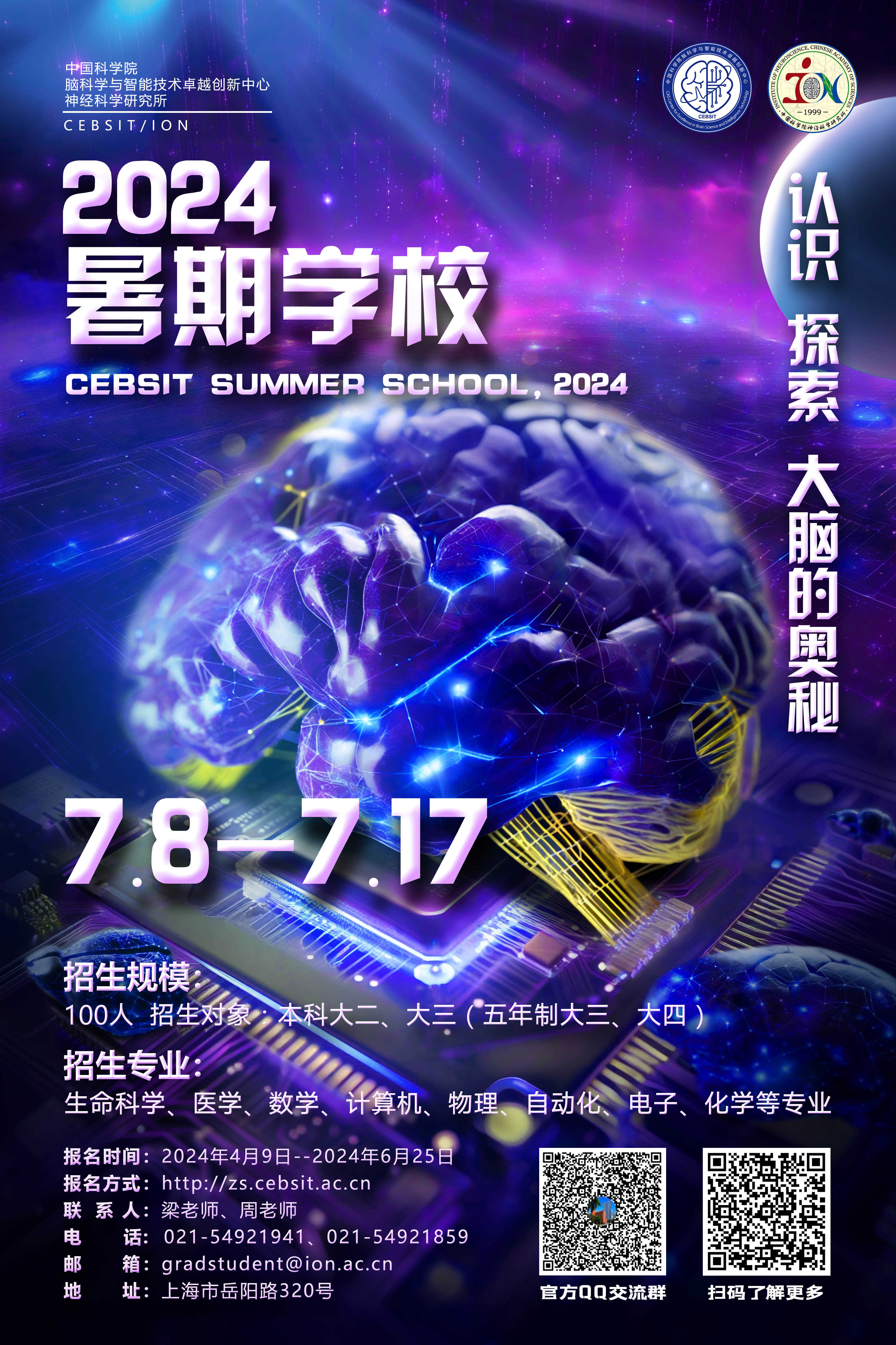 解析大腦的奧秘一直是人類的終極夢想。中國科學院腦科學與智能技術卓越創新中心暑期學校預計將于2024年7月8日 - 7月17日舉行,共招生100人。招生面向大學本科生命科學、醫學、數學、計算機、物理、自動化、電子、化學等專業的二、三年級對腦科學與智能技術感興趣的學生。目的是提高大學生對腦科學與智能技術的認識與興趣,并吸引優秀的大學生加入探索大腦奧秘的行列中,到腦智卓越中心攻讀研究生。