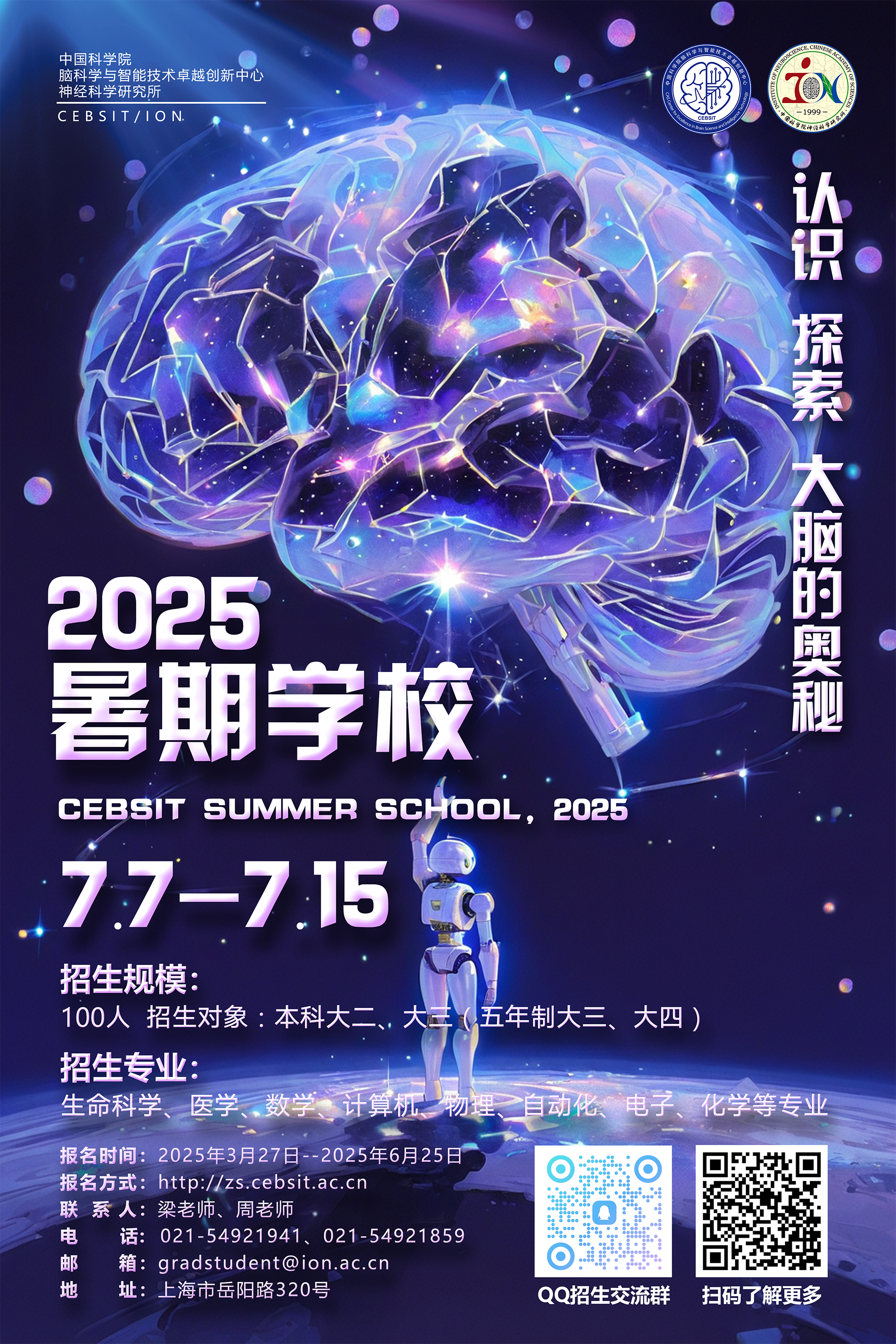 腦智卓越中心暑期學校在2025年將面向全國各高校招收優秀本科生100名,我們將從當中的大三學生(五年制大四)中選拔優秀的學生作為腦智卓越中心2026年入學的免試推薦研究生。腦智卓越中心是中國科學院大學研究生培養點之一。?