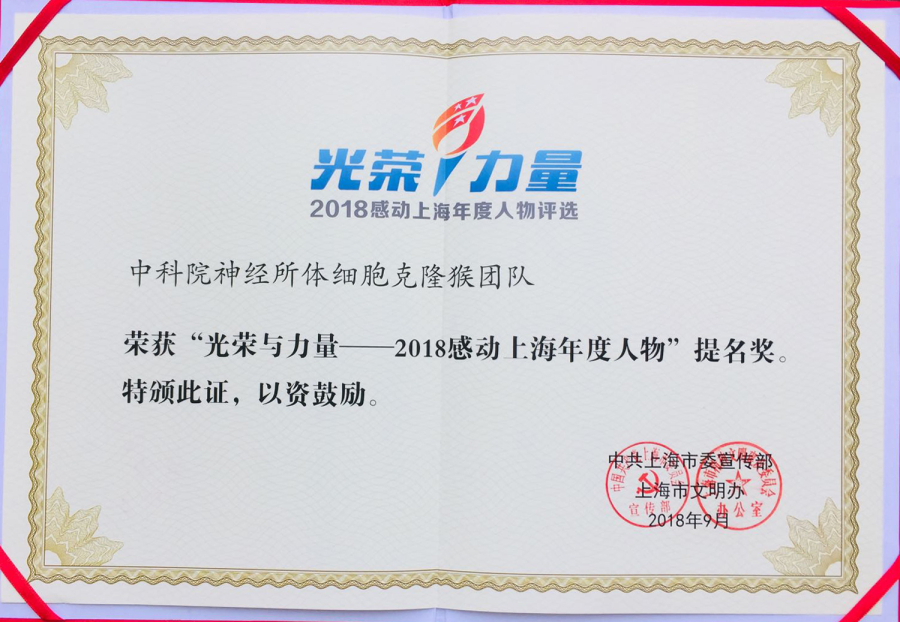 2018年上海光榮與力量感動上海年度人選——體細胞克隆猴團隊