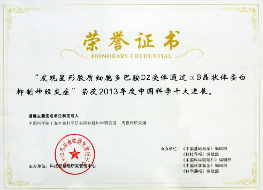 “發現星形膠質細胞多巴胺D2受體通過αB晶狀體蛋白抑制神經炎癥”榮獲2013年度中國科學十大進展