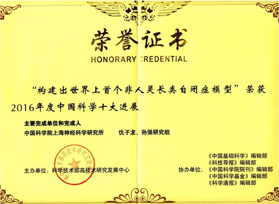 “構(gòu)建出世界上首個(gè)非人靈長(zhǎng)類自閉癥模型”榮獲2016年度中國(guó)科學(xué)十大進(jìn)展